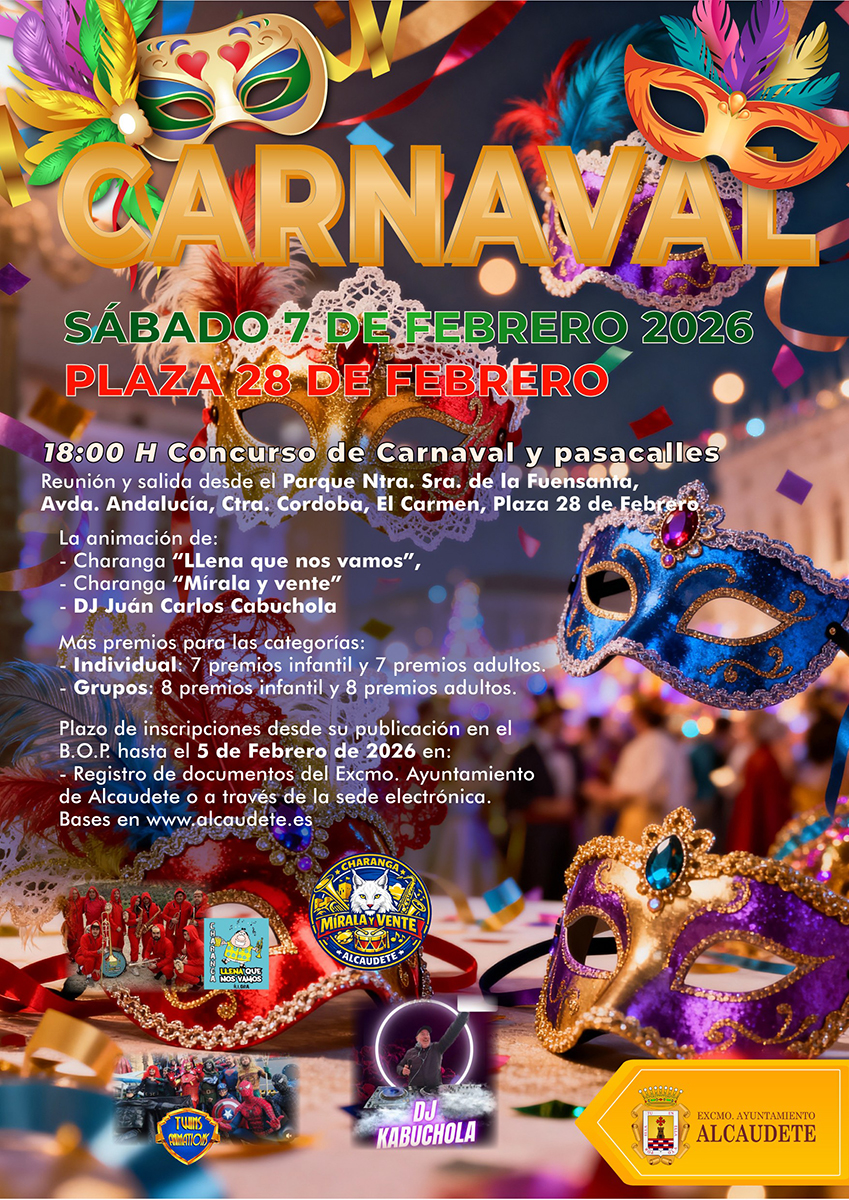 La Concejalía de Cultura del Excmo. Ayuntamiento de Alcaudete (Jaén), con motivo de la celebración de la Festividad de Carnaval, convoca el Concurso Municipal de Carnaval 2026, con el objetivo de fomentar y mantener viva la tradición carnavalesca que siempre ha caracterizado a nuestro municipio.