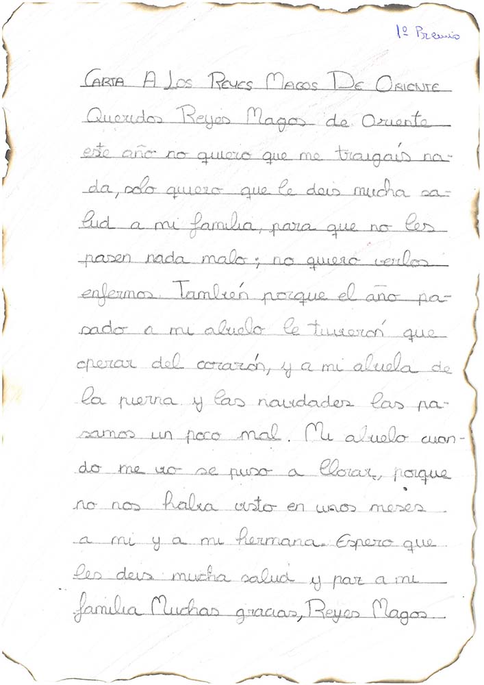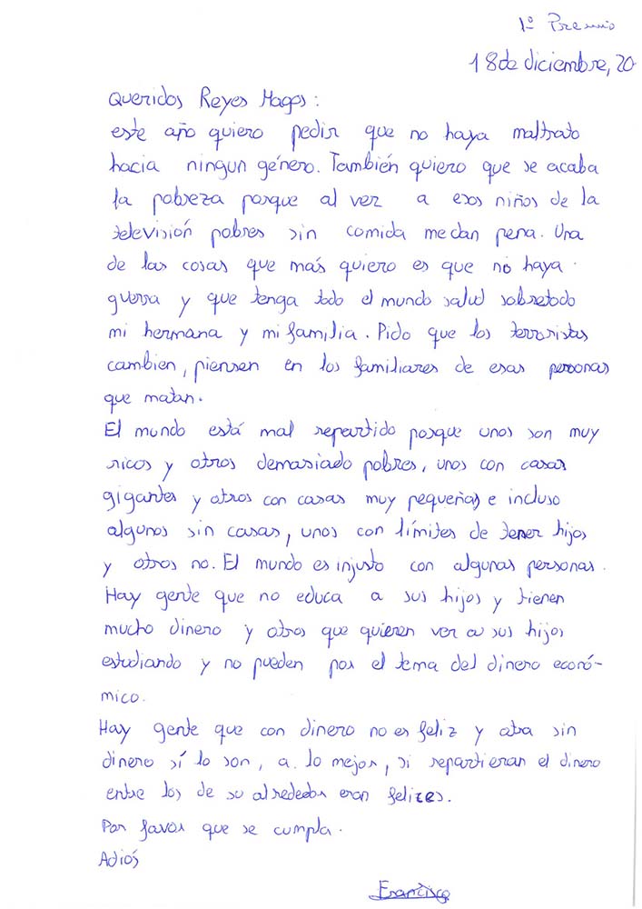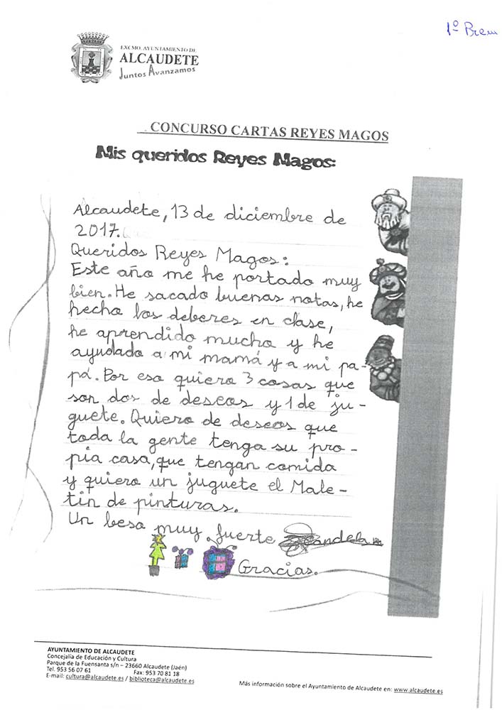 El lunes día 8 de enero se hizo entrega en la Casa de la Cultura de los premios de los distintos concursos que forman parte de la programación cultural que se desarrolla antes y durante la Navidad y la vuelven de alguna manera más cálida y humana. Entregó estos premios el Alcalde Valeriano Martín Cano. En la XIII edición del Concurso de Cartas a los Reyes Magos los ganadores fueron: